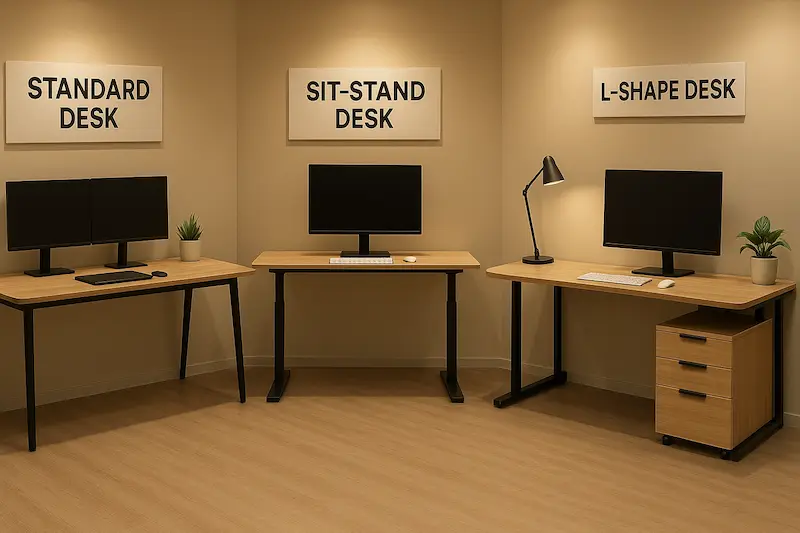 میزهای L-شکل، برای گوشهها و دفاتر با فضاهای خاص طراحی شدهاند. بعضی مدلهای مدرن امکانات اضافهای مثل جعبه مدیریت کابل، پایه مانیتور متحرک و حتی سطح با قابلیت شستوشو دارند. میزهایی با قابلیت تنظیم زاویه پایه به کاهش فشار از روی مچ پا کمک ویژهای میکنند. میتوانید با توجه به فضا و نوع کار خود، یکی از مدلهای مذکور را تهیه کنید.