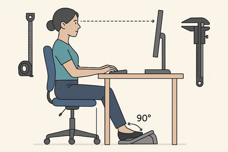 برای بهرهگیری از تمام ظرفیت تجهیزات ارگونومیک باید میز را بهدرستی با بدن خود تنظیم کنید. ارتفاع میز باید به شکلی باشد که ساعد روی سطح میز موازی با زمین قرار بگیرد. صفحه کلید درست مقابل بدن و در ارتفاع مناسب باشد تا فشار طولانی مدت به مچ وارد نشود. فاصله چشم تا نمایشگر بین ۵۰ تا ۷۰ سانتیمتر باشد. تنظیم زاویه مانیتور باعث پیشگیری از خستگی گردن میشود.